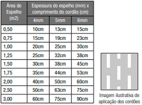 Verificar as condições do substrato Espelho, que deve estar limpo e nivelado. Quando fixar espelhos ancorar com fita dupla face. Aplicar o produto em filetes verticais de 10mm de largura e 6mm de altura conforme a figura. Unir as superfícies obedecendo a distância mínima de 3mm entre o espelho e o substrato e não ultrapassando o tempo de 5 minutos. Verificar o posicionamento do espelho antes da junção ao substrato, pois a fita não permite o reposicionamento. Utilizar calços de apoio na instalação do espelho para auxiliar o processo inicial de fixação do espelho. Retirar os calços no tempo mínimo de 24 horas após a instalação. Após o uso, deixar uma pequena quantidade de produto acima do bico para formar um tampão. Na reutilização, retirar o tampão. Após aberto reutilizar o produto em até uma semana. Limpar as ferramentas antes da cura. Depois de curado o produto só é removido mecanicamente.